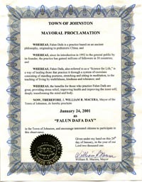 【明慧网2001年1月27日】 罗德岛州约翰斯顿镇宣布2000年12月24日为“法轮大法日”。