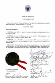 【明慧网2001年1月27日】 罗德岛州威斯特利镇宣布2000年12月8-14日为“法轮大法周”。