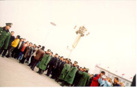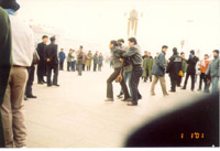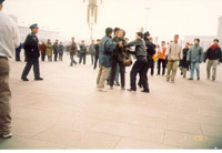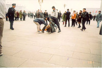 2:一对白人老夫妇在广场摄下了施暴场面,被便衣发现后强令洗掉。围观群众对警察的粗暴都感到很吃惊。穿红黑棉上衣中年男子为一便衣头目。(图6-7)