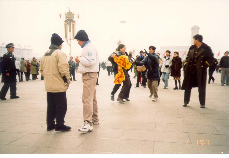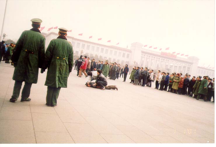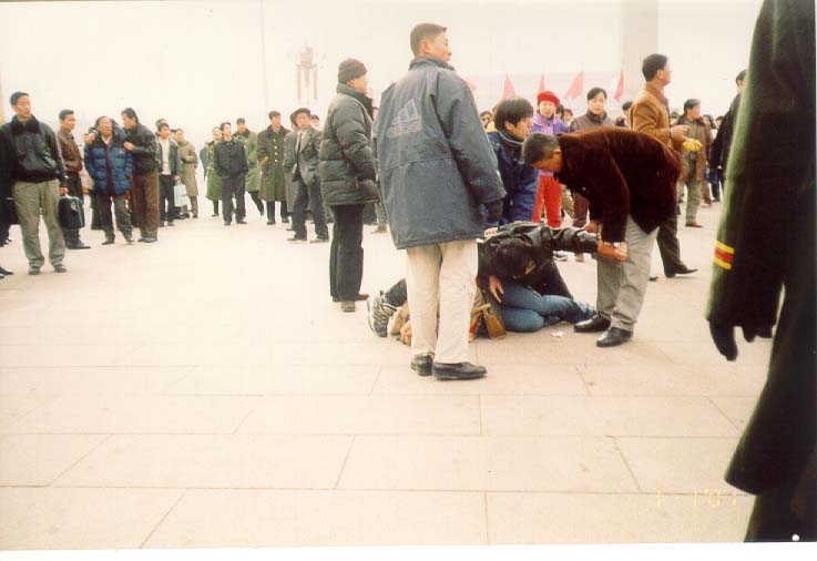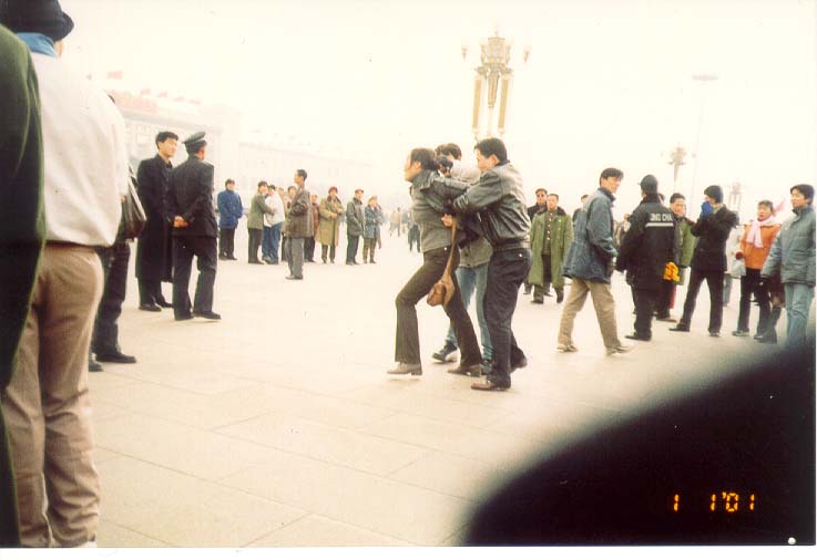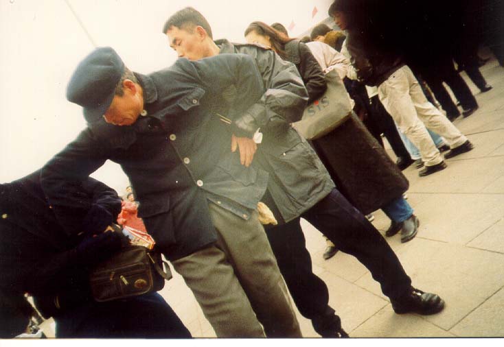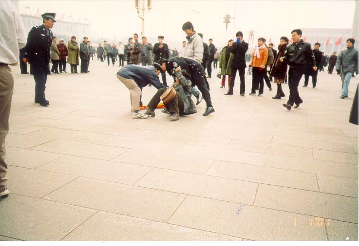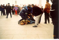 1:一女弟子打开横幅后边跑边喊,被便衣冲出打翻在地,过程为(图1-2-3-4-5)。