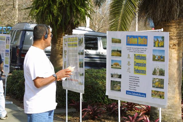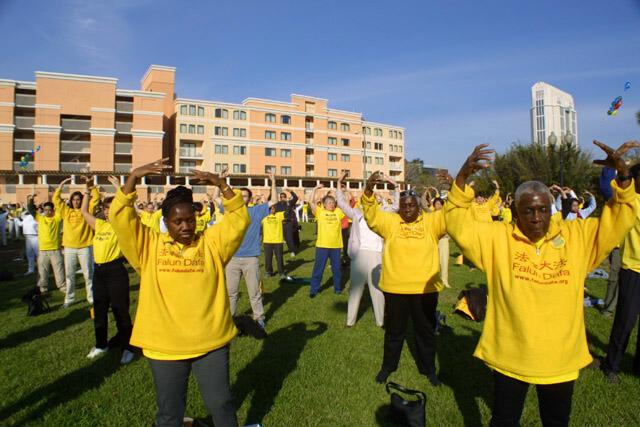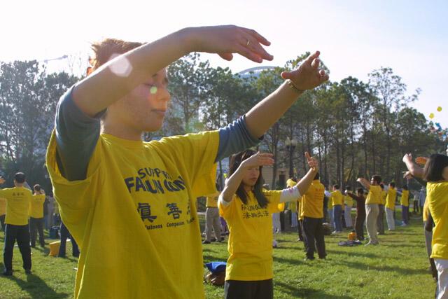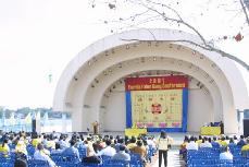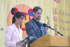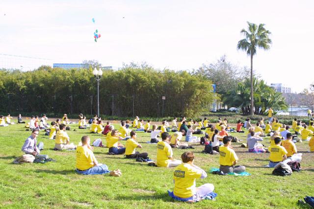 27日清晨首先进行了集体炼功,绿茵茵的草地上站满了来自加拿大和美国各州的学员,其中还有远从欧洲及秘鲁赶来的学员,大家在习习的微风中伴着熟悉的炼功音乐做完了五套功法。11点,奥兰多西人学员代表致开幕词,向所有参加法会的人士表示热烈的欢迎。学员发言生动而感人,其中有年仅4岁和7岁的小姐妹讲述她们过关的经历和向学校老师洪法的过程,有来自小城的79岁的白人夫妇寻找精神归宿并最终投入大法修炼的曲折历程,一位来自欧洲的美国学员讲述了她如何在回欧洲探亲的过程中向亲友洪法并过心性关的有趣经历,有大学的西人学生讲他如何得法,及由动摇到坚定修炼的过程。