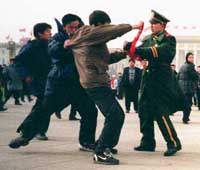 自从1999年年中以来,每一个主要假日,天安门广场都会出现这种场景,数百名穿制服的警察和便衣在游客中搜查抗议者并将他们拖走。