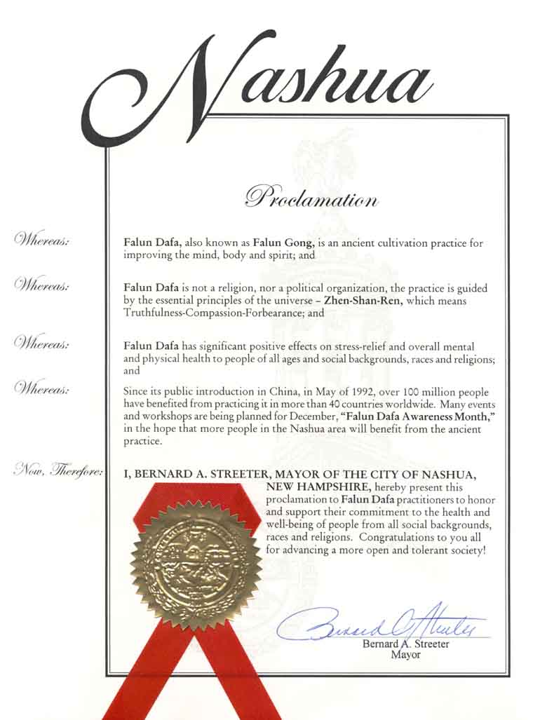 新罕布什尔州纳希瓦市市长褒奖法轮大法学员