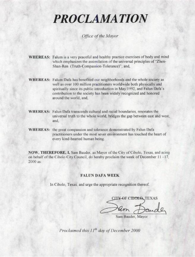 【明慧网2001年1月6日】 德克萨斯州西伯罗市宣布2000年12月11日~17日为“法轮大法周”: