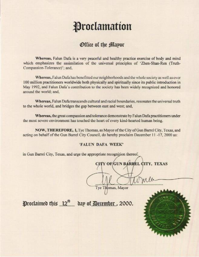 【明慧网2001年1月6日】 德克萨斯州冈伯雷市宣布2000年12月11日~17日为“法轮大法周”: