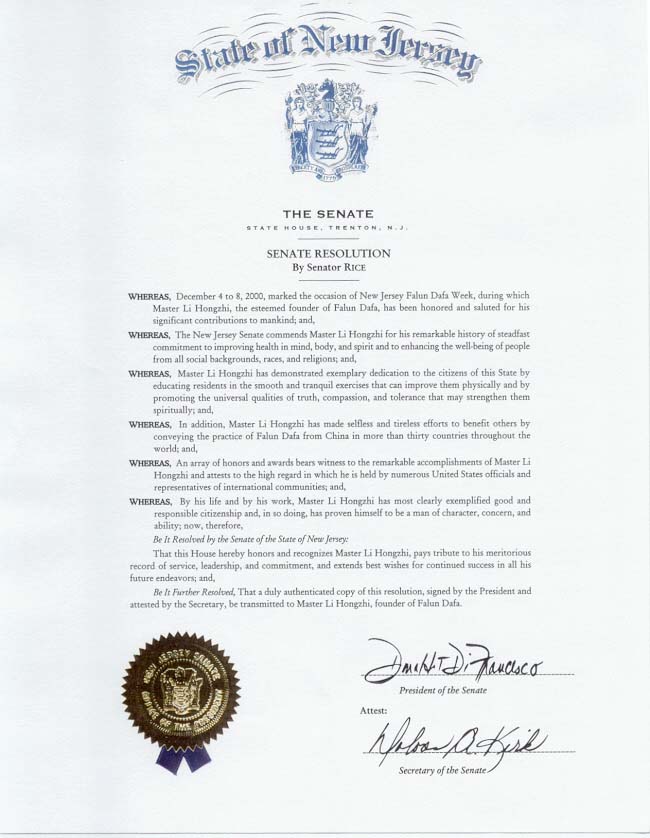 继新泽西州众议院通过了全体众议员向法轮大法创始人李洪志大师致敬的大会决议后,新泽西州参议院也通过了由参议员Rice先生撰写,议长DiFrancesco先生签发的大会决议。