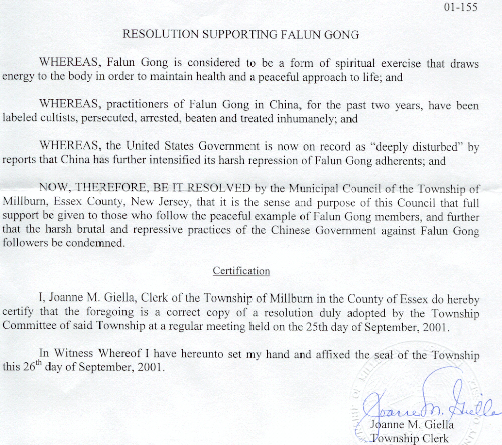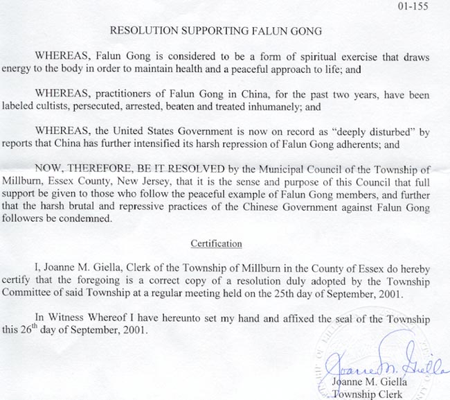 为此,新泽西州艾赛克郡密尔本市市议会决定:本议会全力支持那些以平和的法轮功学员为榜样的人们,并且谴责中国政府对法轮功学员的残酷迫害和镇压。