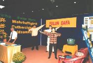 我们的展台位于通道口,两面开放,人流量很大。经过学员的精心布置,展台清新雅致,和四周的商业气氛形成鲜明对比,吸引了大量观众的目光。在凝重的深蓝底色上,鲜明的德文:“永恒的价值:真、善、忍;法轮大法”从很远就能看到。学员为参观者准备了丰富的法轮功介绍资料,从中国的修炼传统,到对法轮功的科学调查,以及在中国发生的迫害,应有尽有。同时还当场免费教功。