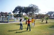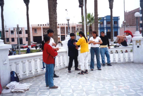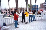 | 步行结束后在勤查(CHINCHA)市公园教功 | 接受皮斯科(PISCO)市电台采访 |