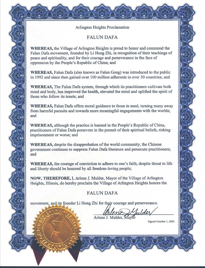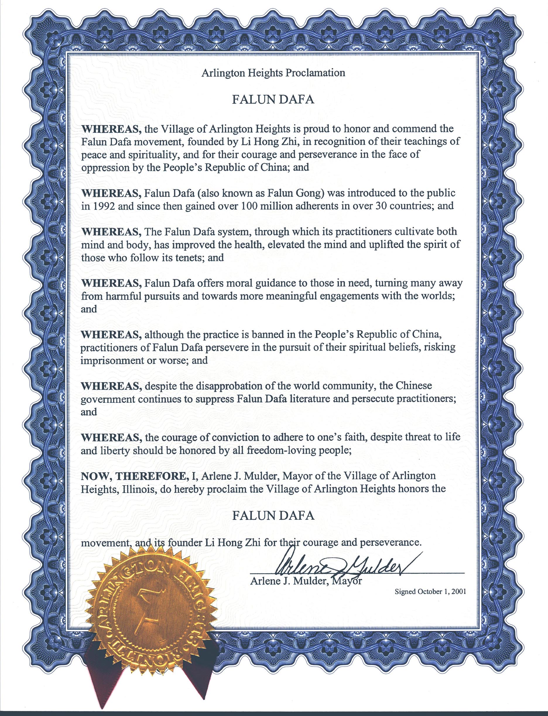 鉴于,艾灵顿海兹村荣幸地褒奖和赞赏由李洪志先生创建的法轮大法,以表彰他们倡导的和平与高尚精神,以及面对中国的压制所表现的勇气和坚韧;