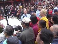 剪彩仪式结束后,市长们乘车离去,恰好又有另外几位西人弟子站在了市长们乘车的地方,他们友善地用不标准的中国话对北京市长说了无数遍“法轮大法好!”