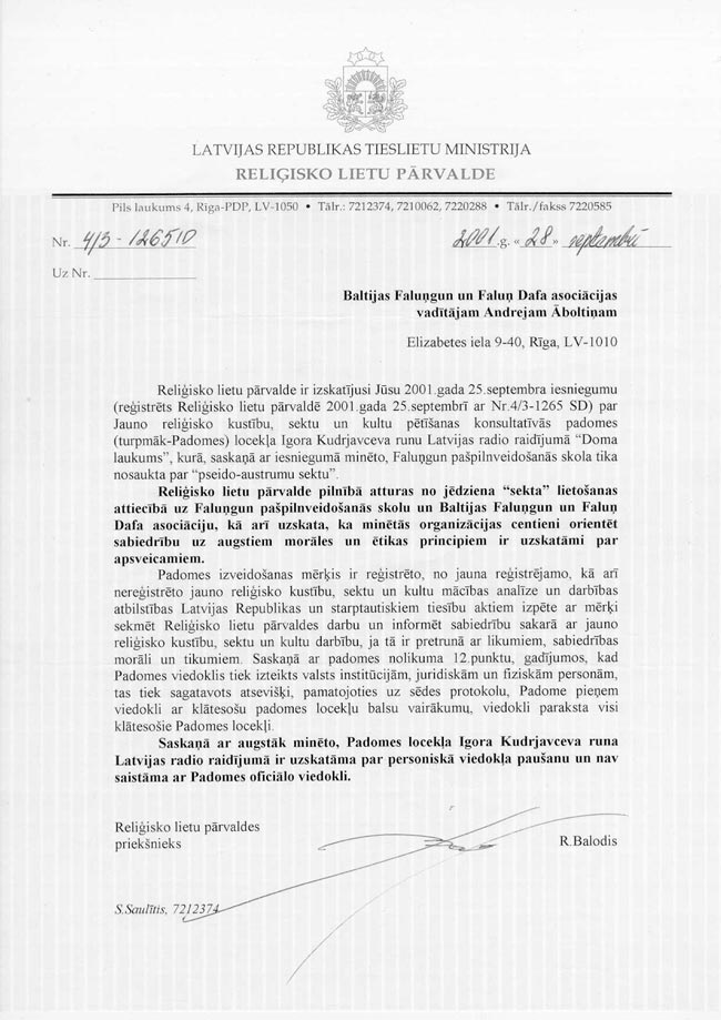宗教事务局对“法轮功修炼法门”及“波罗的海法轮功和法轮大法学会”根本不应用“教派”这一术语来称呼;同时我们认为,该组织致力于使社会向高尚的伦理道德标准方向发展的努力应该受到恭贺、奖励和尊敬。