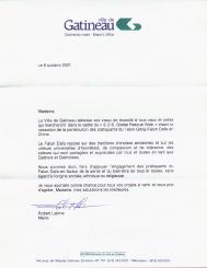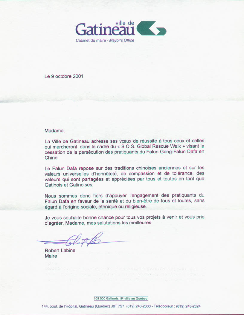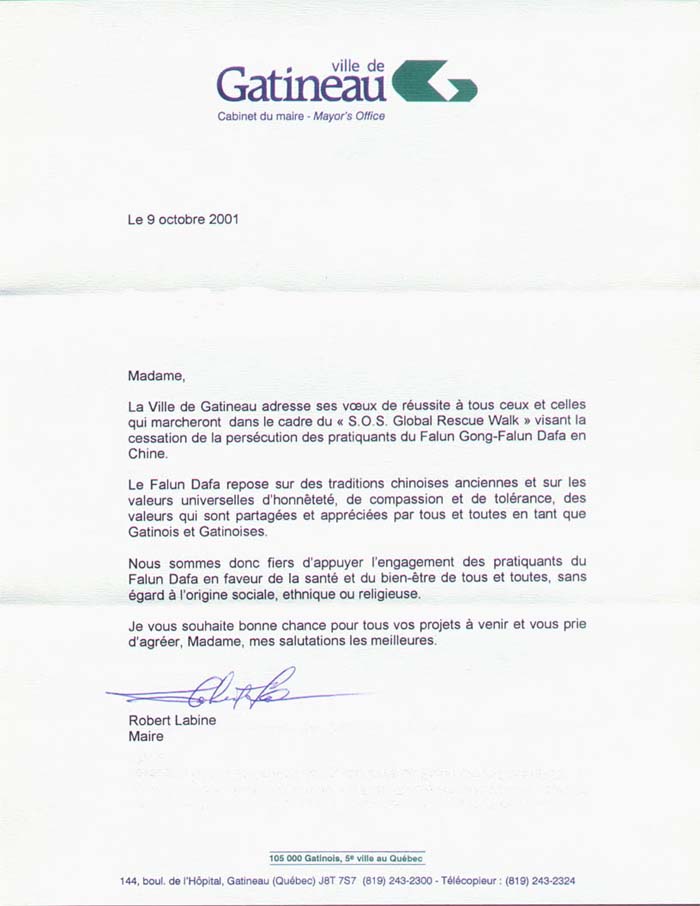 Gatineau市市政府向所有进行“全球SOS紧急救援步行”的、向为制止中国迫害法轮功--法轮大法修炼者而参与步行的女士们和男士们表示祝愿,祝愿步行成功。