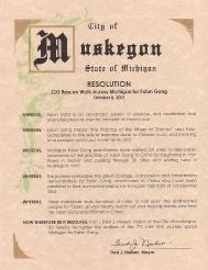 鉴于,密西根州法轮功学员的步行开始于底特律市哈特广场,沿途穿越20个城市,结束于此地马斯基根市,完成步行221英里,以此行动唤请公众了解法轮功在中国的情况;并且