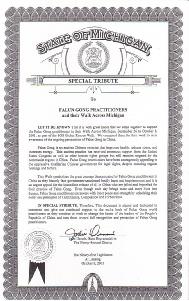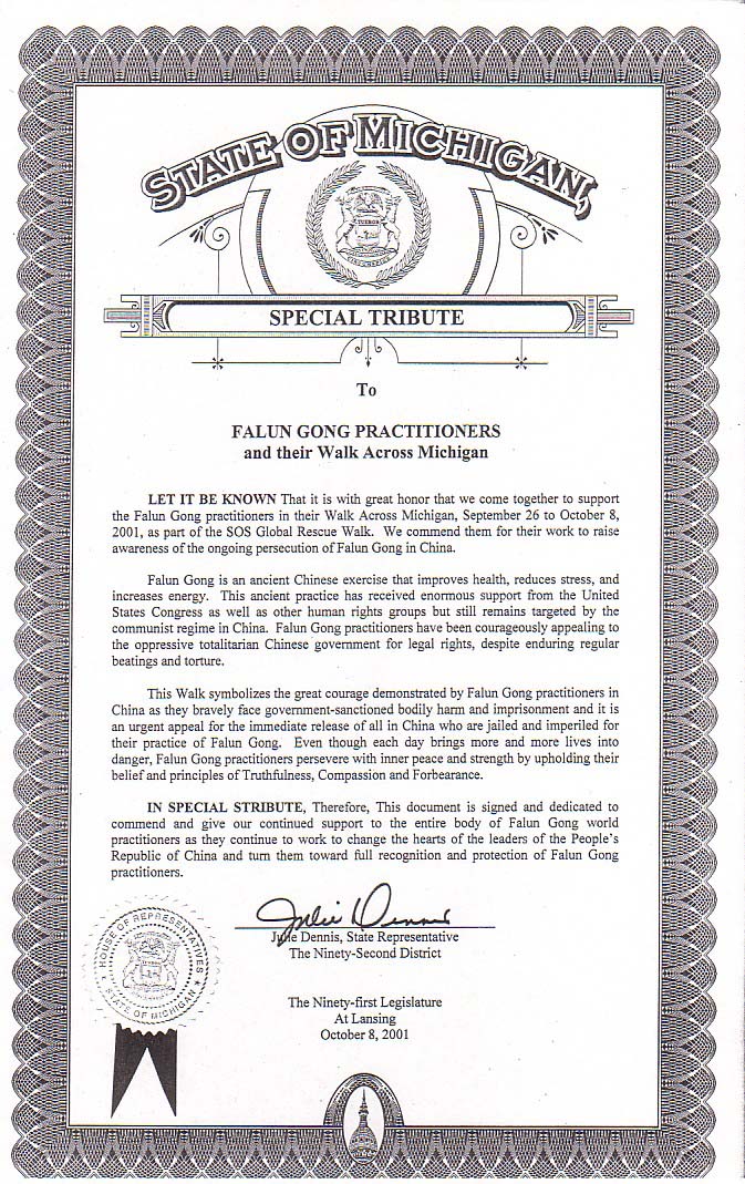 【明慧网2001年10月18日】密西根州的第91州议会,2001年10月8日于密西根州府兰辛(Lansing)签署了特别褒奖文献,褒扬该州法轮功学员穿越密西根的SOS步行。译文如下: