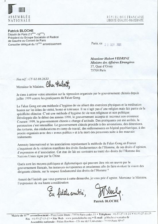 大赦国际和在法国的代表法轮功这一功法的一些协会对这种严重侵犯基本人权,言论权,结社权的行为表示担忧。这些状况违背了中国签字的联合国人权公约。