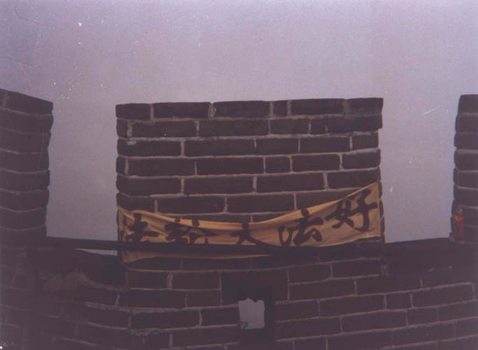 第二天一大早,我们就出发了。到广场后,我们站在人群中,估算了身后警卫的位置和我们预计所要站立的方位,然后我们缓步到达那里,每人扯住横幅的一角,迅速将横幅张开并高举过头顶:五个红色大字“法轮大法好”在黄底的映衬下终于展现在大家的眼前。离我们五步之遥的一位中年妇女就站定在那里,默默注视着我们的横幅,一句话也没说。广场上的巡逻也不知道站到哪里去了,没了动静。当时,我们分别喊出了我们想告知世人的话。随后,我们收起横幅,迅速走入地下通道,离开了广场。那时我并没有成功后的喜悦,我反而觉得我的声音还不够响,横幅也应该多举一会儿。