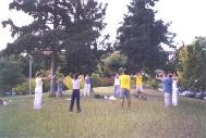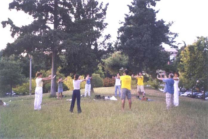 图片三:希腊第二大城市萨龙尼克(Saloniki)的第一个炼功点建立了。在萨龙尼克的阿里斯托托大学和国际展览会外面,我们在一个小时之内就派发出了1500张传单。在那里,第一个法轮功炼功点建立了。多数参加者都曾炼过其它功法。