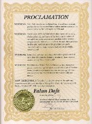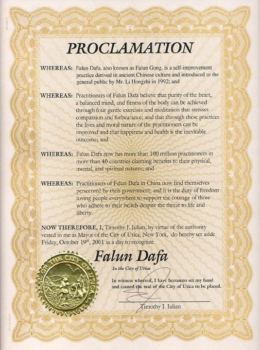 【明慧网2001年10月23日】2001年10月19日,加拿大蒙特利尔──渥太华──纽约的SOS步行学员来到纽约州尤提卡市,市长朱利安出席了市府门前的新闻发布会并宣读了他签署的褒奖令。将这一天命名为尤提卡市“法轮大法日”。