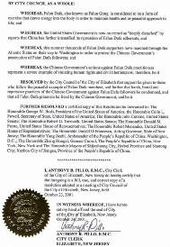 为此,伊丽莎白市市议会决定:本议会全力支持那些以平和的法轮功学员为榜样的人们,谴责中国政府对法轮功学员的残酷迫害和镇压,呼吁中国政府释放所有被监禁的法轮功学员。