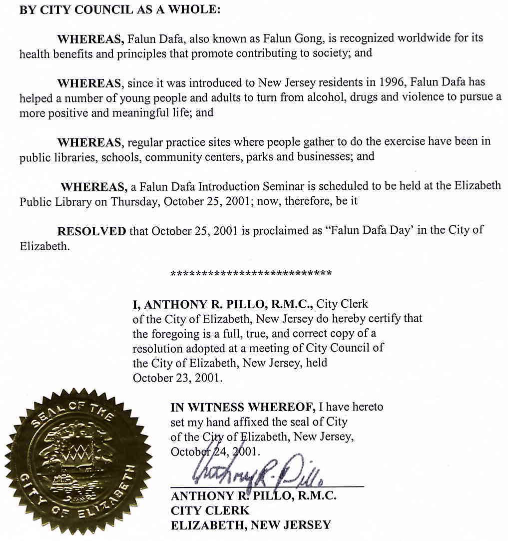伊丽莎白市市议会决定:宣布2001年10月25日为伊丽莎白市“法轮大法日”。