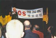 接下来,公爵的家人苏斯女士演唱了“愤怒的灵魂”,她演绎一位外来的灵魂被人间的酷刑所感伤、痛苦、哭泣。 大法弟子展示的优美、安详、舒和的功法,慈悲、静谧的大法音乐,公爵先生动情的演讲,以中英文“真、善、忍”、“释放赵明”的横幅为舞台背景,给观众带来一种全新的感受和体验,剧场安静极了,人们的精神进入了另一境界,演出结束后,数秒钟,剧场仍是静谧、空寂,接下来,报以热烈掌声。 下台后,我们不时受到观众竖起大拇指称赞“美极了”。人们不敢相信,这么美的功法,这么善良的大法修炼者,正遭受人类有史以来最残忍的酷刑折磨!这个反差太大了。观众取走了我们的大法真相资料,还有的主动找到我们索取“停止镇压法轮功”的签名表签名。
