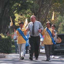 报导说法轮功学员举着旗帜,佩戴饰带,穿着写有“中国:停止迫害法轮功” 的黄恤衫,拿着印有SOS字样的横幅。他们在吉尔罗伊城区非常显眼,甚至市长汤姆·斯普林格也陪伴他们从第六街来到旧市政厅。抗议者们包括九位女士和一位男士,年龄从25岁到62岁不等。他们希望500英里步行的艰辛能唤起人们对正在遭受更大痛苦的中国法轮功学员的关心 - 他们被酷刑折磨,甚至因不放弃信仰而被迫害致死。这个步行队伍是全球步行活动的组成部份。