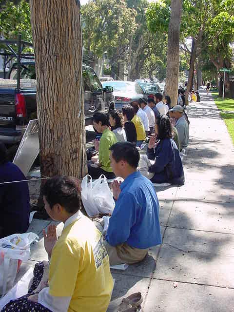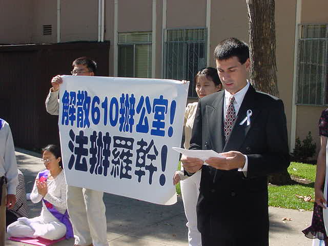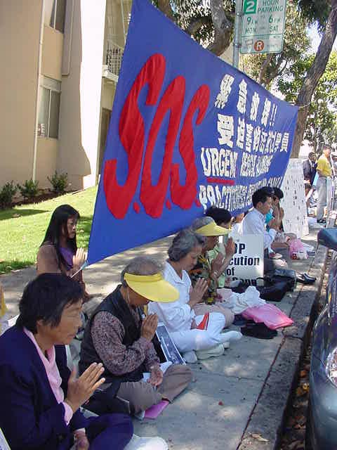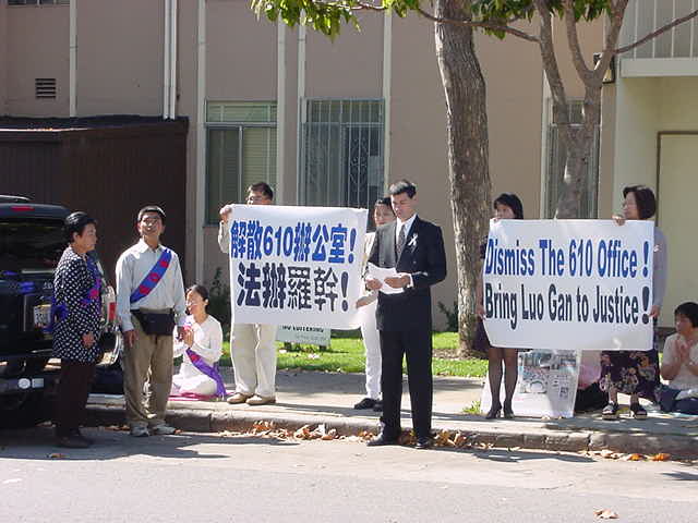 【明慧网2001年10月3日】惊闻辽宁省朝阳市三十二岁妇女于秀玲因修炼法轮功在被折磨的奄奄一息后,被警察自四楼窗户扔下,活活摔死的消息,旧金山地区一百多名大法学员于第二天中午前往领馆请愿,要求法办人性全无的罗干,江XX政府中善良百姓、大法学员的最为邪恶的爪牙。