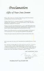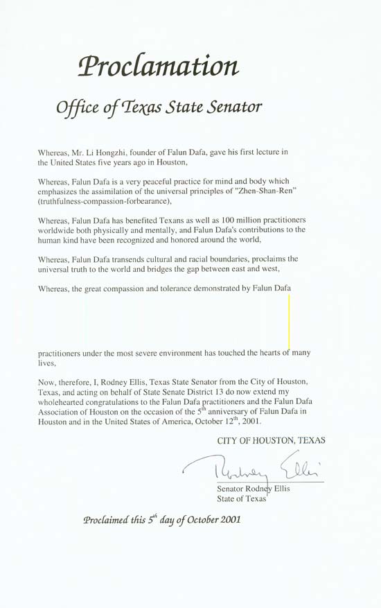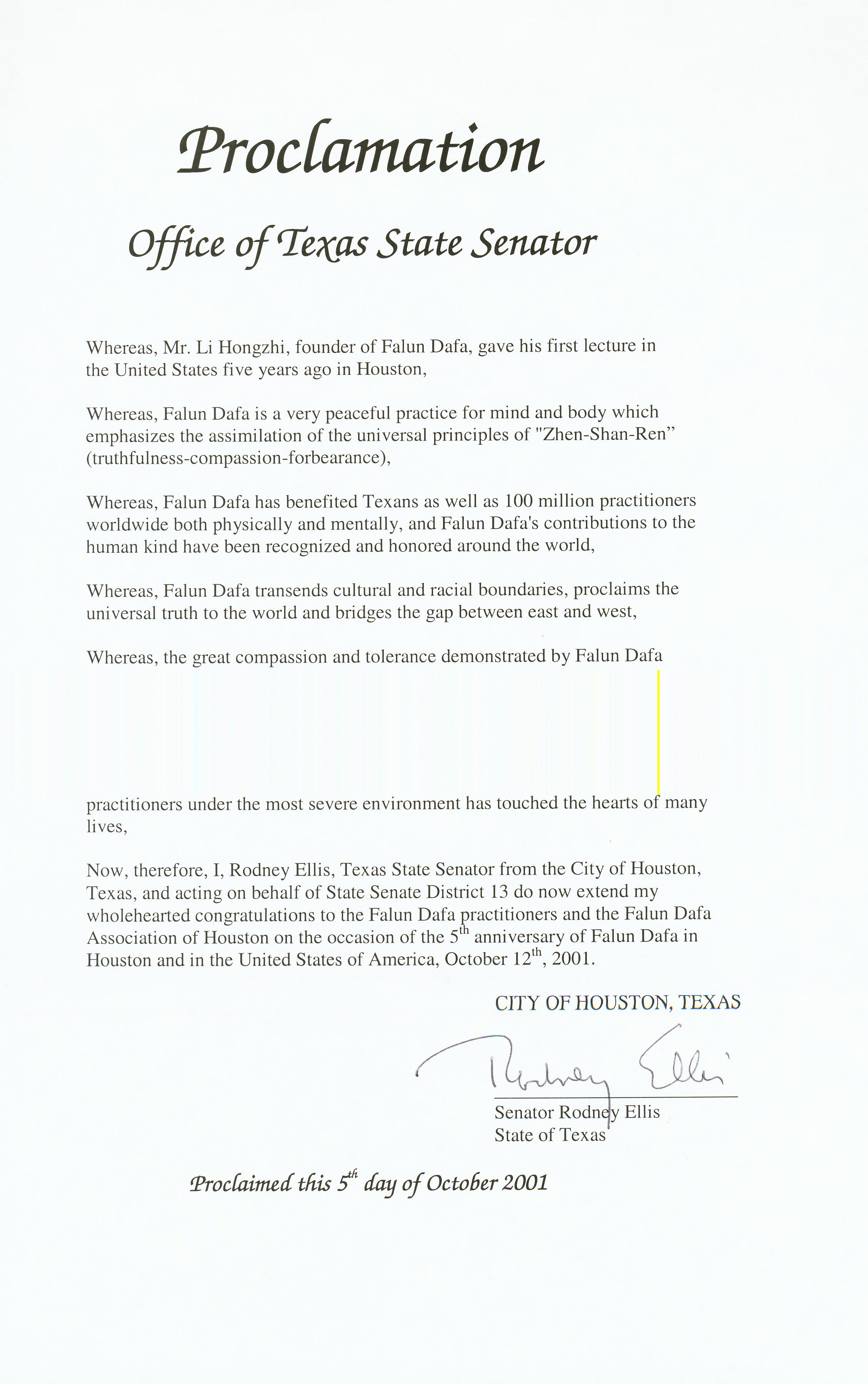 因此,我,罗德尼.艾利斯,德州休斯顿参议员,代表第13选区,就休斯顿法轮大法五周年(2001年10月12日)向法轮大法学员及学会致以衷心的祝贺。