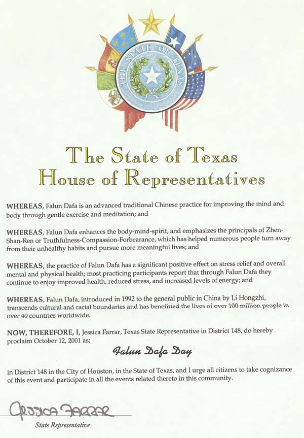 现在,因此,我,杰西卡.法拉,德州第148区议员宣布2001年10月12日为休斯顿市第148区“法轮大法日”,并号召所有居民认知这一事件及参加所有有关活动。