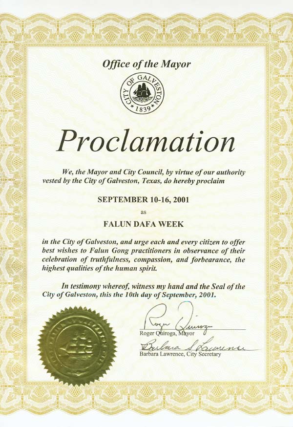 【明慧网2001年10月4日】得克萨斯州甘威斯顿市宣布2001年9月10-16日为“法轮大法周”。
