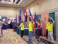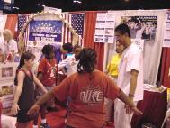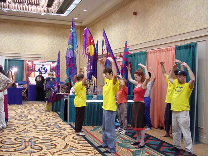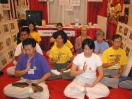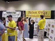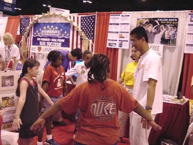 在法轮功对面的展位上是太极拳展位。法轮功学员们和他们的教练交谈,探讨气功,并向他们介绍法轮功。他们对法轮功非常感兴趣并邀请法轮功学员和他们同台表演。一些太极队的学员询问法轮功在当地的炼功点,希望能去参加他们的炼功活动。参展的人们对法轮功产生了极大的兴趣,很多人大人孩子前来学习功法。有大约三千人得到了法轮功的资料。