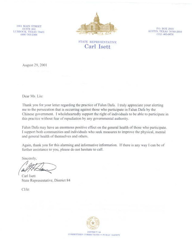 感谢你关于法轮大法的来信。真心地感谢你提醒我关注正在发生的中国(江XX)政府对法轮大法修炼者的迫害。我毫无保留地支持这种个人的修炼权利不应受任何一个政府当局的残害。