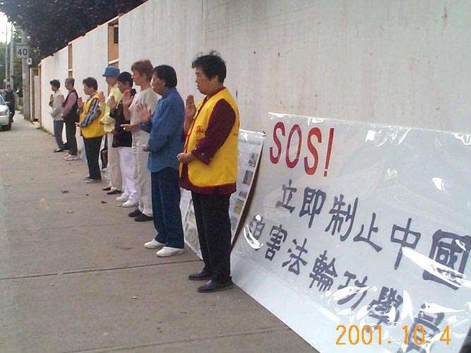 在这里我们正告多伦多总领馆,停止骚扰海外法轮功学员,帮助制止发生在中国的镇压法轮功运动,不要再做江泽民、罗干之流的帮凶了。如再执迷不悟,只能做江罗之流的陪葬品。