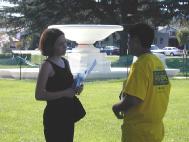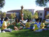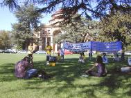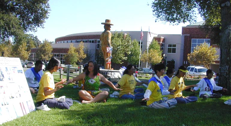 不到中午,学员们就走了近十英里,到达今天我们媒体活动地点。因为时间还早,我们便开始炼功和分发传单给公园附近的人。一名学员则将《法轮功》送到街对过的市政厅图书馆里。管理人员答应一定会尽快将书注册,提供给本地的读者。