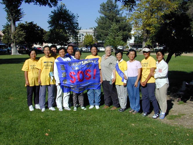 当我们媒体的活动结束后正打算离开时,一名美国老太太突然出现在我们面前,手里拿着十美元让我们收下。原来她叫玛莎(Martha),也是从当地的媒体中得知我们步行至此,恰好碰上我们,希望能够给我们帮助。我们解释说不接受捐款,如果她希望帮助法轮功,可以捐款给法轮功之友或按SOS传单上的要求给本地议员写信或打电话,敦促中国停止迫害法轮功。她欣然接受的我们的建议,并高兴地与学员们合影。