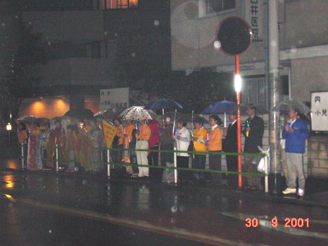 9月30日,来自日本各地的大法学员约60人,再次云集东京的中国驻日大使馆前请愿,并在当晚就地举行了烛光守夜活动。以抗议国内对法轮功学员的残酷迫害与虐杀。并呼吁: