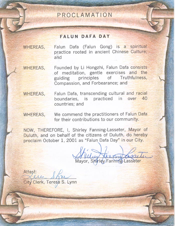 【明慧网2001年10月7日】乔治亚州德鲁斯市宣布市长Shirley Fanning-Lasseter宣布2001年10月1日为“法轮大法日”。
