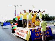 十点过后游行正式开始了,在我们彩车的前面是中英文“法轮大法”的横幅,彩车上有四人表演一到四套功法,一人表演第五套功法,后面还有一辆贴上“SOS:紧急救援中国大陆受迫害的法轮功弟子”和“中国:停止虐杀”的英文标语,剩下的弟子向两旁的民众发SOS的讲清真象传单。我们的游行车装饰得很漂亮,左边、右边和后边分别挂上了“法轮大法”和“真,善,忍”的横幅,彩车的边缘上还有六十多朵美丽的粉色莲花点缀,五颜六色的气球飘荡在空中。