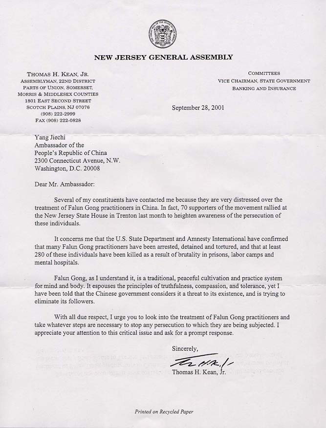 【明慧网2001年10月7日】9月28日,新泽西州众议员肯恩先生致信中国驻美大使,希望其对中国法轮功学员遭受迫害这一重大事件予以调查,并要求中国大使采取一切必要手段阻止任何迫害的发生。肯恩众议员在信中说:“令我担忧的是,美国国务院及大赦国际已经证实:许多法轮功学员被逮捕,关押和折磨;至少有280人在监狱,劳改营和精神病院中被虐待致死。”“我认为,法轮功是一个以“真善忍”为准则,传统、平和的身心修炼系统。可我却被告知,中国政府认为它的存在是对其的一个威胁,所以要尽力铲除它的追随者。”