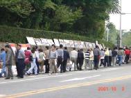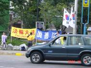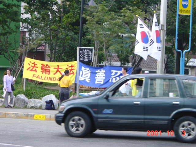此话并不夸张。从地铁站到孝昌运动场的人行道两旁列队站满了热情传递大法传单的汉城学员,100多幅大法图片、大法横幅标语加之利用一席之地炼功的学员们,洪亮而悲壮的普度、济世音乐……所有这一切的确给来到这里的每一个人以深刻的印象。