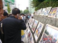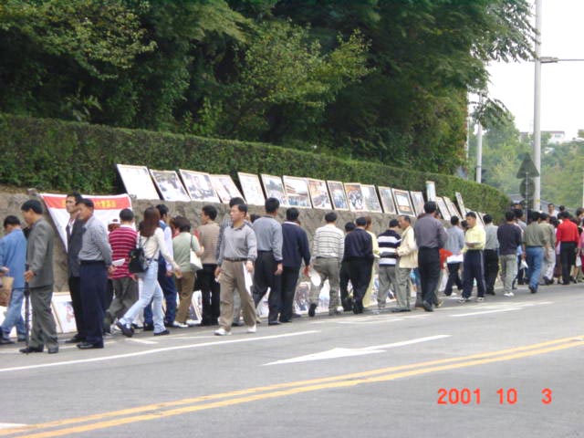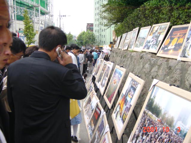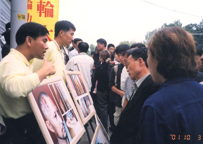 何止是这些?从早晨8时至下午1时人潮流向孝昌运动场,而下午1时始,不知是运动场容不下那么多人或早已入场观看节目的人往家赶路,人潮开始倒流,从运动场流向地铁口,形同上午形成一条350米长长的人流。上午匆匆进场的人们,退场时显然放慢脚步,在大法图片面前形成三、四层人墙,尤其在大陆被邪恶遭受毒打致死致残的法轮功弟子照片面前,围过来的人最多。这些朝鲜族大多数是年龄在50多岁左右的人,多数是中国镇压法轮功之前来韩打工的。这些人在韩国只能通过韩国媒体的中国翻版报道认识法轮功,并在大陆家人的电话中得知大陆镇压法轮功很凶。而今首次看到、听到我们介绍法轮功、讲清法轮功真相,立即牵动着他们的心,他们渴望想了解法轮功到底是怎么回事儿,为什么遭到了镇压,法轮功将会怎样等等问题。每一组图片旁边或后面都站着几位学员与那些围过来的人们交谈着,有时竟谈半个多小时……因为他们来自大陆,不少人曾经历过文革,他们深知那里的情况,当他们通过大法图片见到一些真实的情况,加之我们学员作以详细的介绍,他们才知道中国正在重演着“指鹿为马”的悲剧,他们纷纷说:“在中国也没见到这些多法轮功照片,没想到在汉城见到。”“把人打成这个样子,太残忍啦!”“已经害死了几百人?!他们不是说炼法轮功的自杀的吗?……”“大陆搞运动时都那么凶,过一个时期就平反,说不定法轮功到一定时候也得平反呢。”
