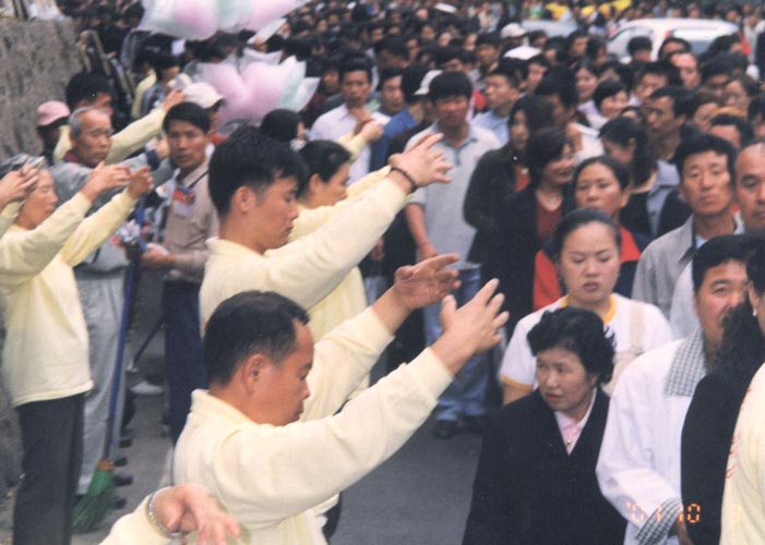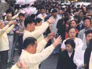 这数万朝鲜族都来自中国大陆,大多数年龄在40岁以上。也许他们是来自大陆或是与大法有缘吧,他们显然较之韩国人更加关注法轮功,从他们身上能够体察到他们真心想知道法轮功真相,真心关切将来法轮功能不能在大陆得到平反。因而,当早晨8时人潮如流涌出孝昌公园地铁口,出口处两位学员发传单发不过来的情况下,当这些来自中国的朝鲜族知道出口正在散发法轮功传单时,原来喧哗不堪的人们竟主动排好队一个一个地接过传单后再移动,曾一度出现这种神奇的现象令在出口处散发传单的学员感动不已,说见此情景她们感动得快要流泪了……