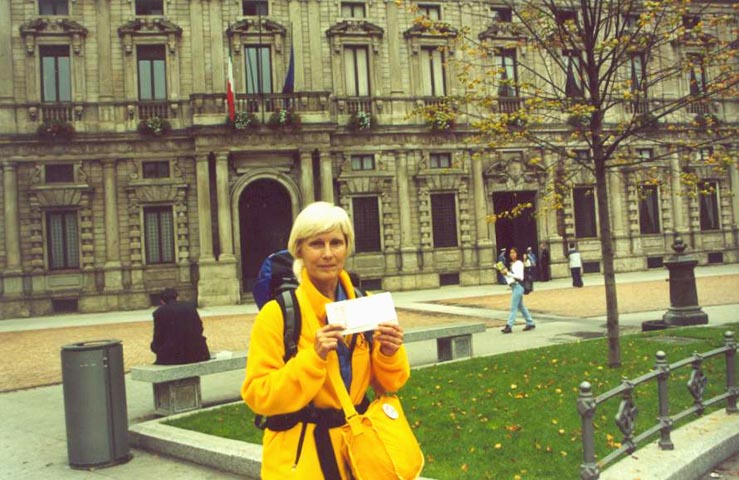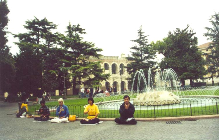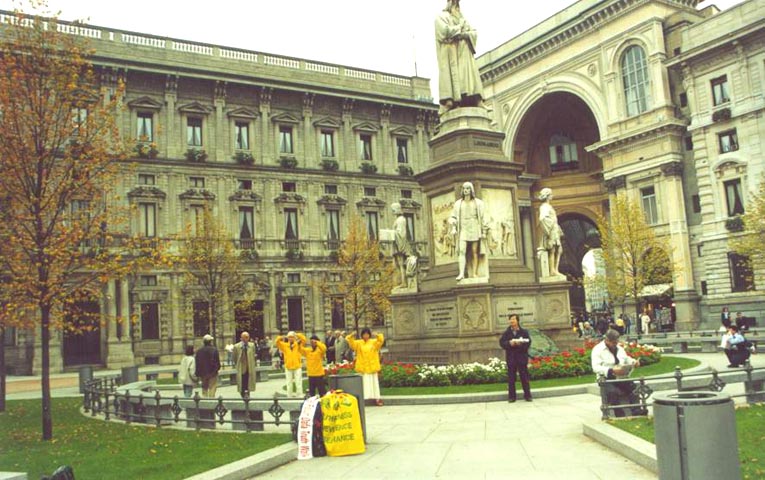十月二日一早,在当地学员的帮助下,顺利来到市政府。递交了SOS真相材料。他们对此事非常重视,并开了带有印章的政府收据。之后几位学员在米兰市政府前发正念炼功,发材料。吸引了很多群众,并遇到了加拿大来的中国旅游团。他们领取了中文报纸和真相材料,并与加拿大学员畅谈了许久。然后五位学员带了几百份材料来到了米兰的中国城。发完后继续乘火车赶向维罗娜。