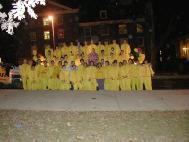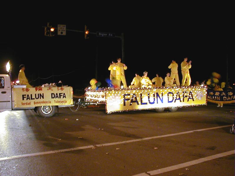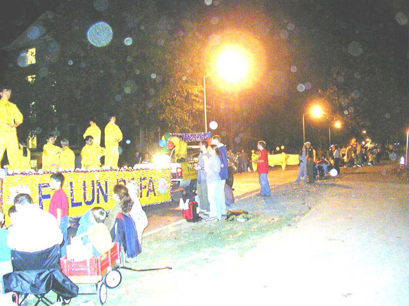 在准备花车时,找车子是首要的问题。就这么巧有一位养牛的农夫愿意将他的拖车和卡车借给我们装饰和使用,他并愿意替我们在游行当天当我们的司机。他的善心相助让我在准备花车上踏出了稳健的第一步。因为在此地只有我一位学员,这里离其他有大法弟子的大城市平均要四个小时的车程,新泽西州的同修却很快答应要提前一天到这儿来装饰花车,让我非常感动。除此之外,因为游行是在晚上,灯光的装置是非常重要的。就在同修担心要如何装灯光照明时,我无意中和一位刚认识不久的朋友谈起花车游行的事,才知道这位朋友从年轻时就是专门搞电和做圣诞灯的,虽然他非常忙,他还是答应深夜来替我们装灯。其他弘法的旗帜、资料、气球等材料也由新州和费城的学员提供。还有一位刚认识没多久的朋友,听闻大法不久后便戒烟戒酒,使他深深感到大法的神奇,这次他为我们提供食物。这所有的一切师父是如此巧妙的替我们安排着,所有看似不可能的事在佛法无边下都那么自然地实现了。