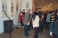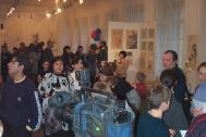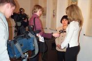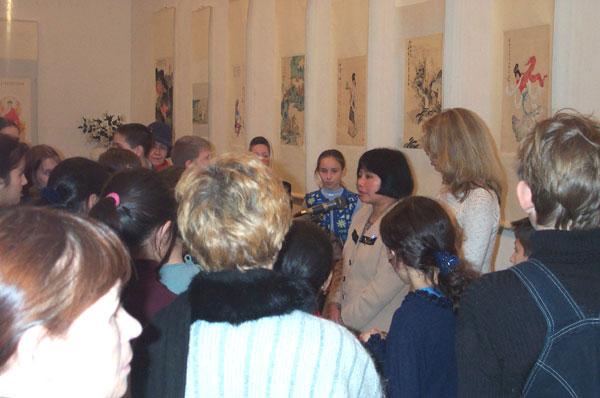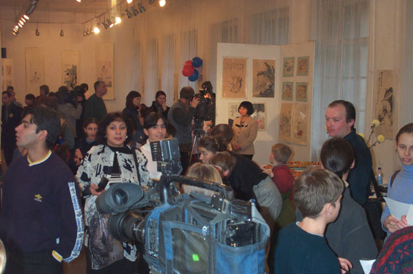 圣彼得堡学员在市中心大海街的国立画家联盟大楼里租了200多平米的展览厅用于正法图片展和我的个人画展。一早上我们还在布置展厅时,记者们就已一个接一个地来了。我一下子愣住了,此时离展览正式开始还有一个小时,我又不会俄语,只见四五家电视台的记者们一个个争先恐后地对着画不停地拍摄,还有三家电台,其中包括俄罗斯最大的电台和一些报刊杂志的记者也在纷纷拍照和录音,我一下子忙坏了,记者们排着队采访我在中国受迫害的遭遇;还没通知开记者招待会就来了这么一大堆记者,把整个展厅挤得满满的。明天开记者招待会时一定会有更多的媒体到访。更令人感动的是不到两个小时学员们就看到听到电视台六频道和一著名电台等就作了非常详细的报导。