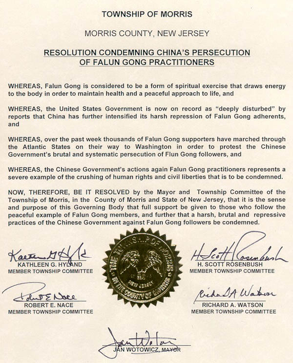 为此,新泽西州摩利斯郡摩利斯市市长和市议会决定:本政府机构全力支持那些以平和的法轮功学员为榜样的人们,谴责中国政府对法轮功学员的残酷迫害和镇压。