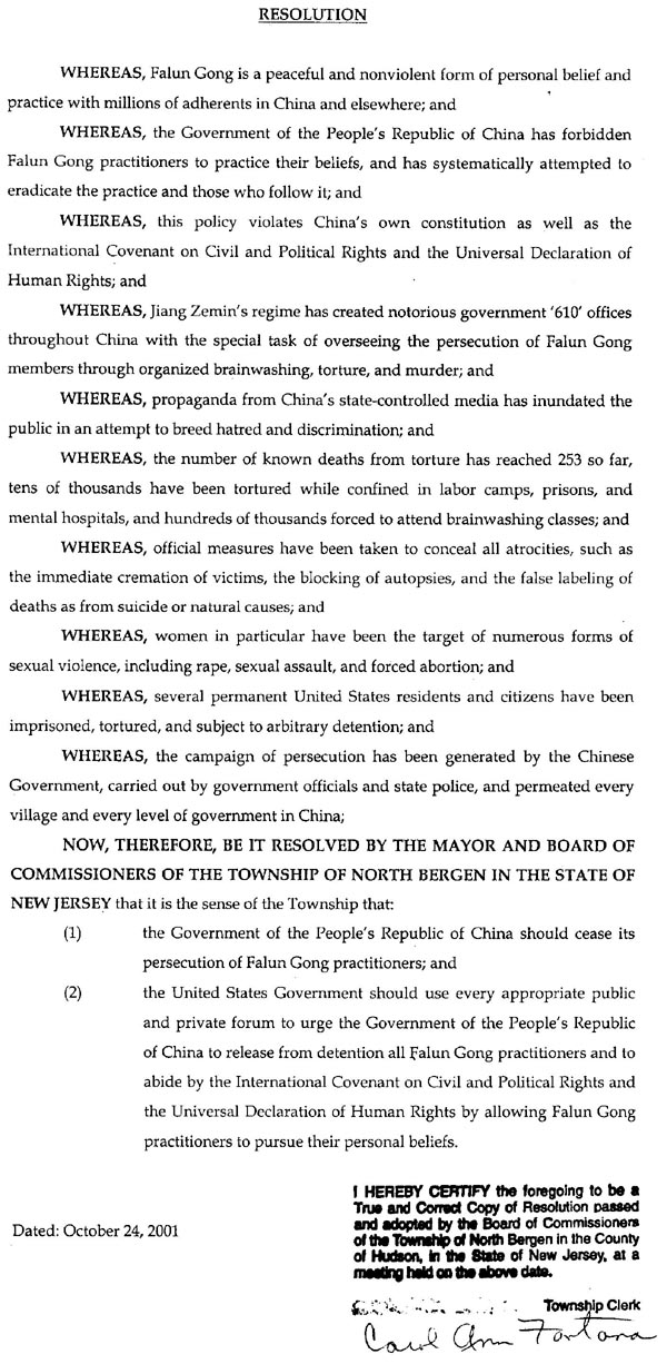 鉴于,法轮功是一种平和,非暴力的个人信仰和修炼方法,在中国及其它地方有数百万的修炼者;并且,