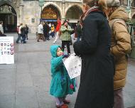 晚上天更冷了。瑟瑟寒风中,弟子们手持点燃的蜡烛,伴随着 ‘普度’ ‘济世’的旋律,立在广场上静静地守候。弟子中有七十多岁的白发老人,还有的弟子带着刚刚满100天的婴儿也来了,推着婴儿车和我们站在一起,过往的行人问我们在这么冷的天在这里做什么。当他们知道了为什么时,被感动了,他们对我们说:“你们是和平的,祝你们成功!”