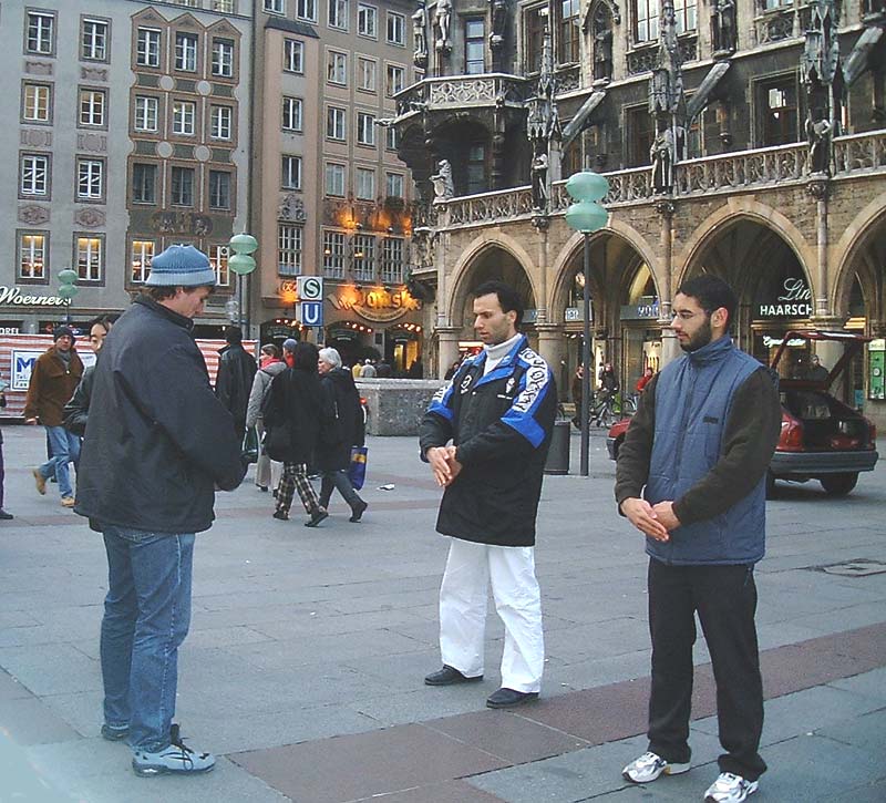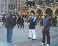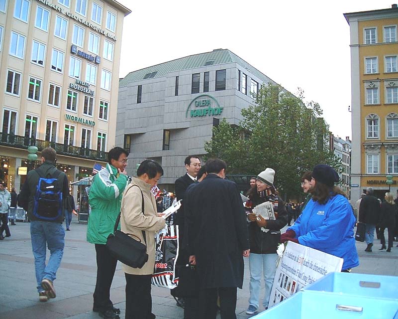 玛丽亚广场地处市中心,商场林立,还集中了慕尼黑的观光景点,同时还是市政府所在地,到处是采购的市民,观光的游客,熙熙攘攘,人流不绝。我们的活动一开始,就吸引了很多行人驻足观看。弟子们演示功法,向人们讲解大法的美好,弟子们祥和的炼功场面,展板上邪恶血腥的镇压,这鲜明的对比,震惊了世人,人们难以相信在21世纪的今天,在中国竟然还存在着对基本人权这样肆无忌惮的践踏。